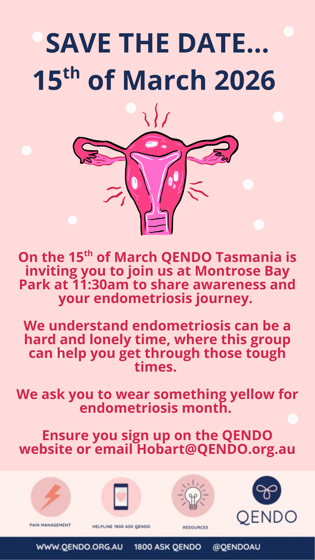 Endometriosis awareness month is coming up and we will be supporting every woman who suffers with this tough disease on the 15th of March at 11:30am at Montrose Bay Park.